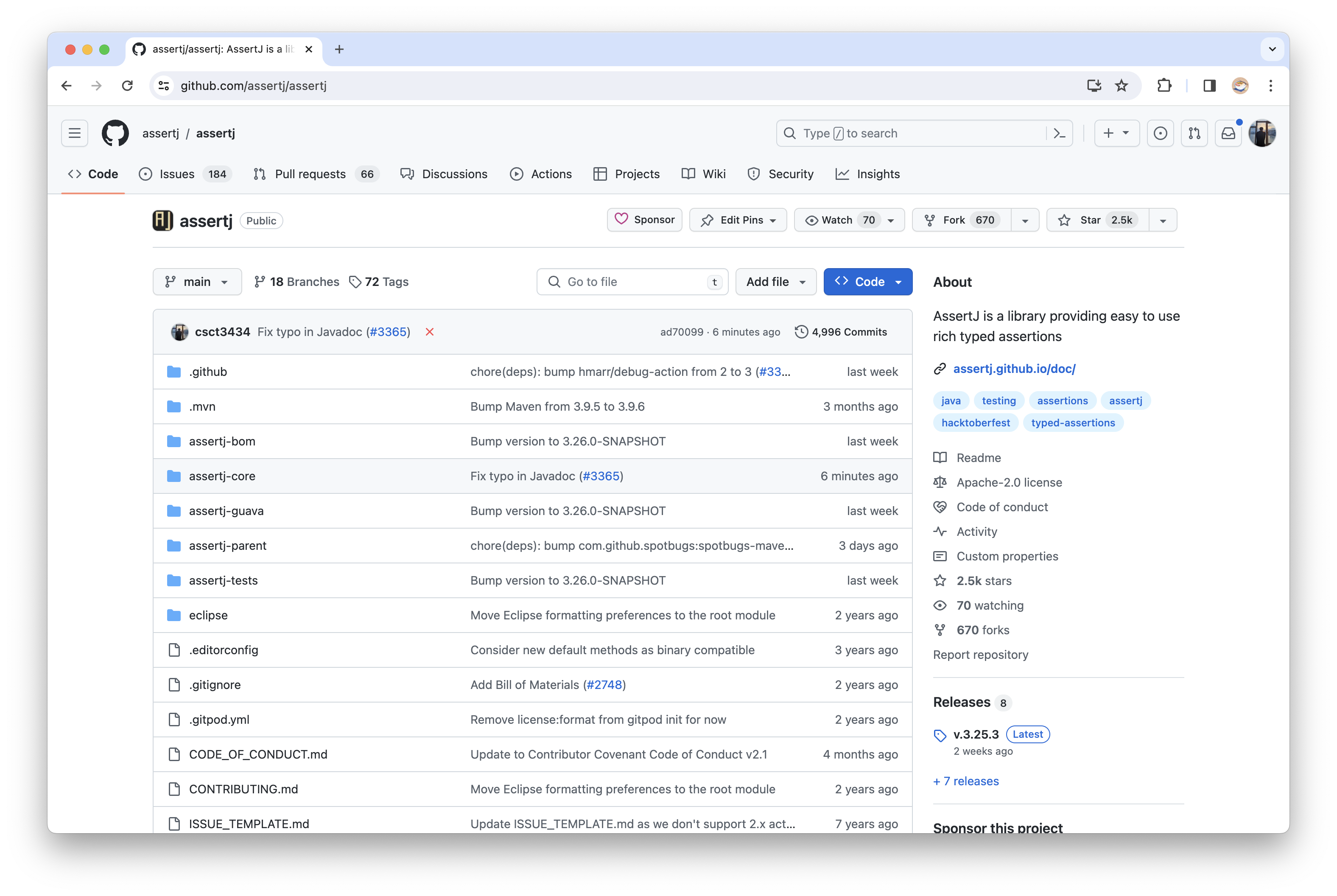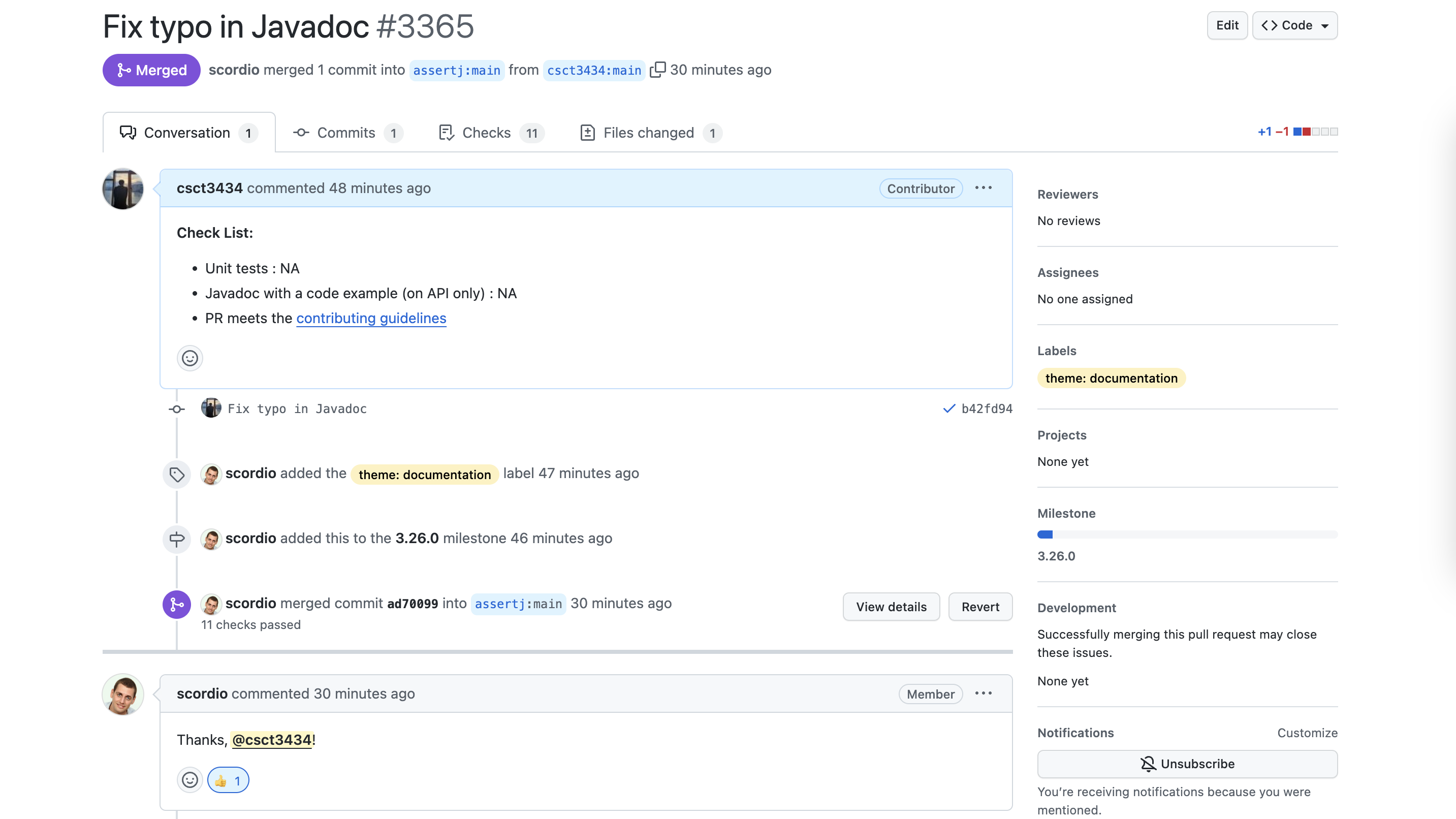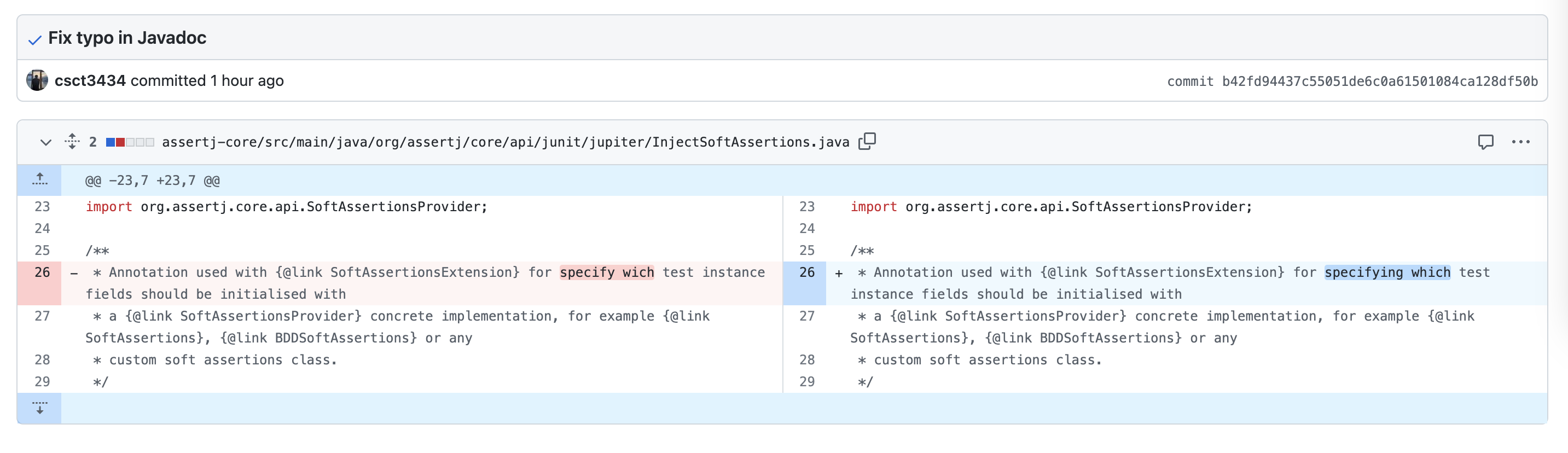 주석에 있던 오타를 정정한 게 전부였지만, 오픈소스 기여 경험이 없었고 그 대상도 자바 개발자라면 한번쯤 들어본 AssertJ 라이브러리여서 몹시 두근거렸다 ❤️🔥