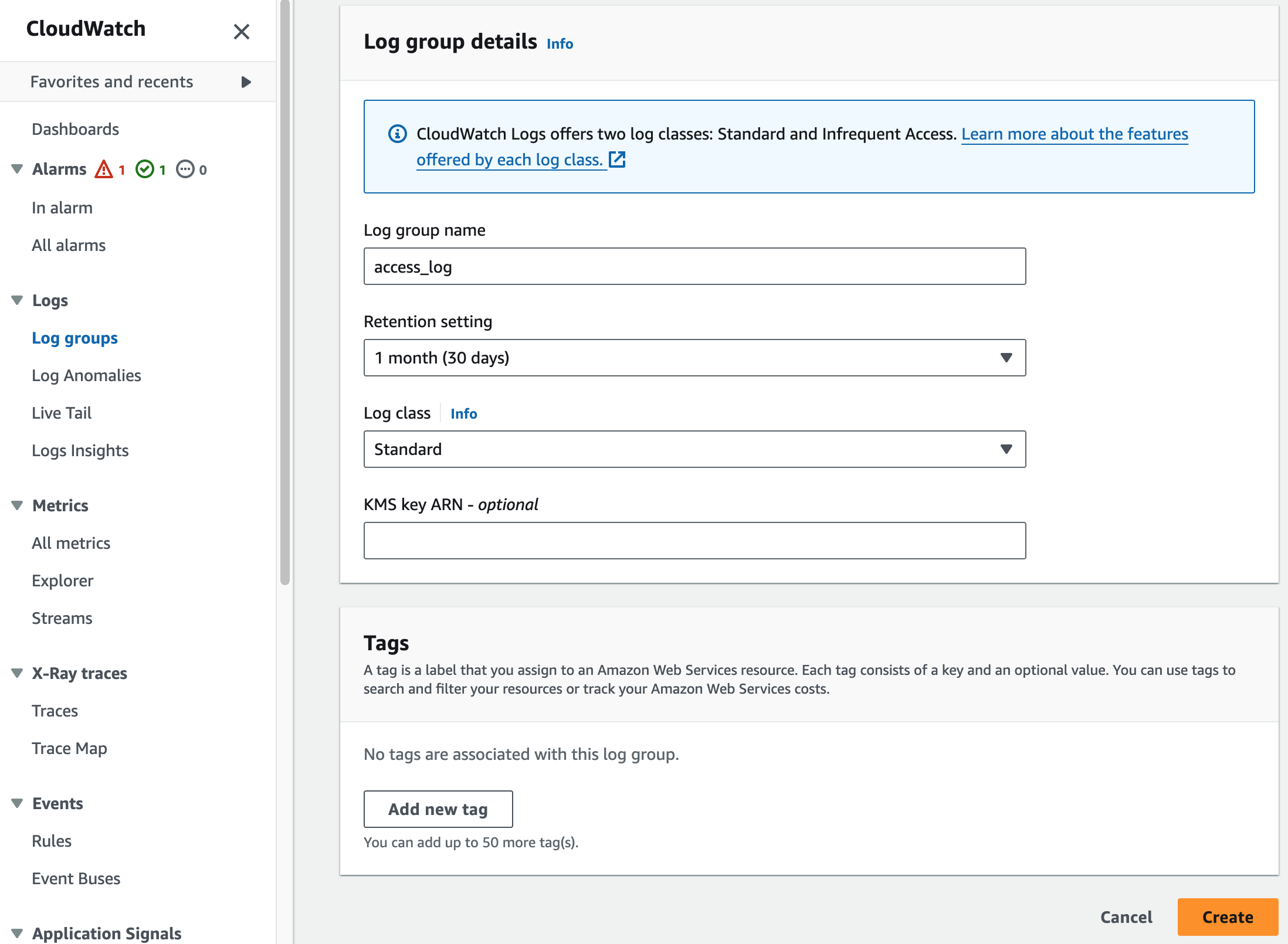 - [CloudWatch] -> [Logs | Log groups] -> [Create log group]