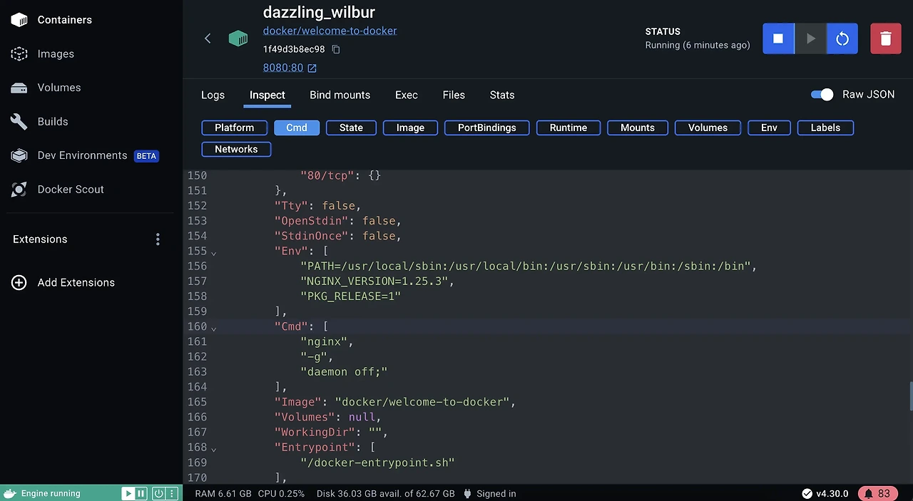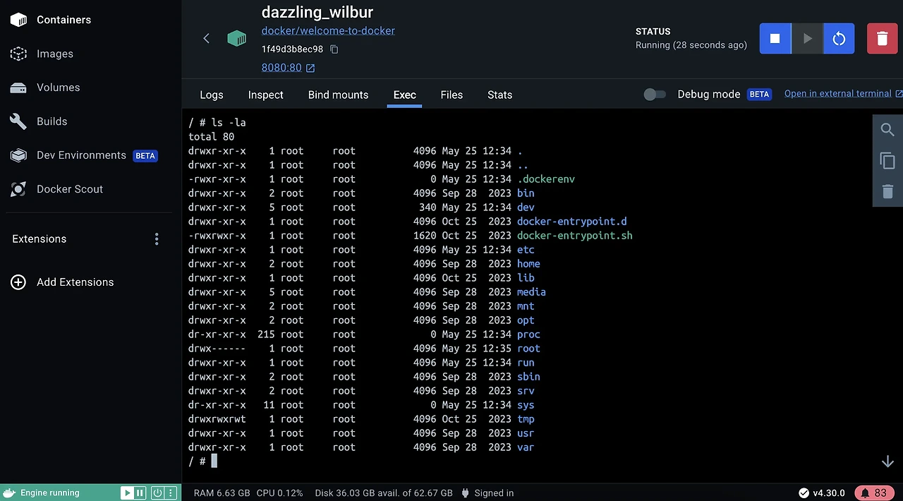 - Inspect 탭에서 컨테이너의 설정 정보를 확인하고, Exec 탭을 통해 컨테이너 내부 쉘에 접근할 수 있습니다.