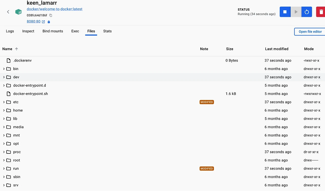 Docker Desktop의 Containers 탭에서 실행 중인 컨테이너를 선택한 후, Files 탭을 클릭하면 컨테이너 내부 파일 시스템을 탐색할 수 있습니다.