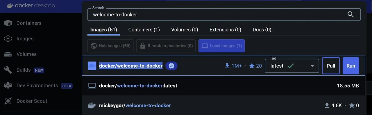 - Docker Desktop을 실행한 후, 상단 검색창에서 welcome-to-docker를 입력합니다.