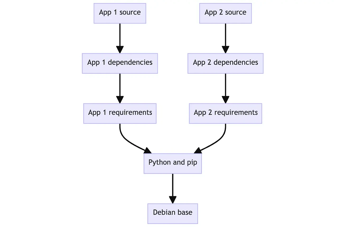 이와 같은 구조 덕분에, 이미지들간에 레이어를 재사용할 수 있습니다. 예를 들어, 또 다른 Python 애플리케이션을 만들고 싶다면, 기존의 Python 실행 환경을 그대로 사용할 수 있습니다. 이렇게 하면 빌드 속도가 빨라지고, 이미지를 배포하기 위한 저장 공간 및 네트워크 대역폭을 절약할 수 있습니다. 이미지 레이어는 다른 사람이 작성한 이미지의 베이스 레이어를 재사용하여, 자신의 애플리케이션에서 필요한 데이터만을 추가하여 이미지를 확장할 수 있도록 해줍니다.